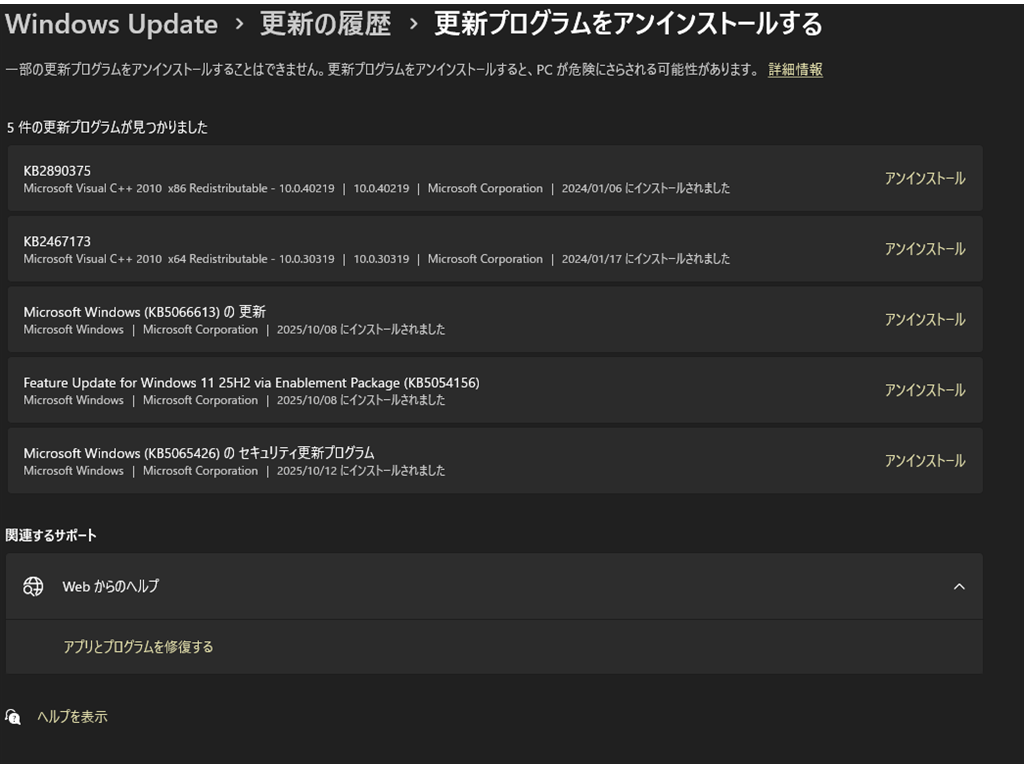 上記の画像はすでに「KB5065789」をアンストした後なのでありませんが、不具合が起きているあなたの画面には「KB5065789」があるはずです。